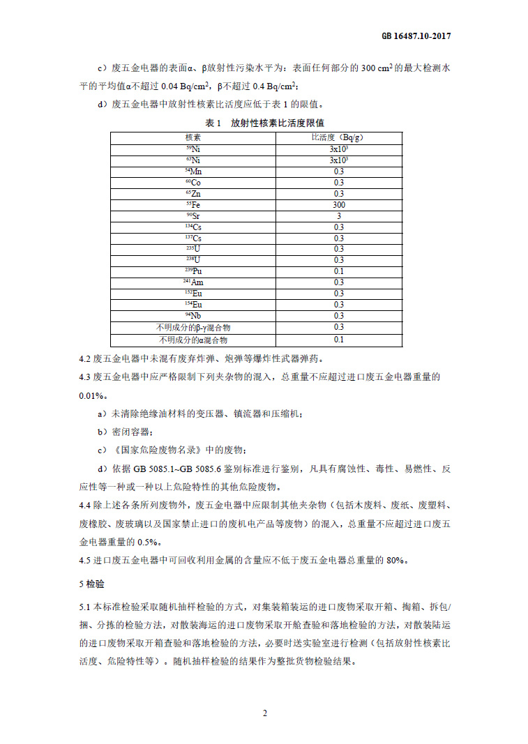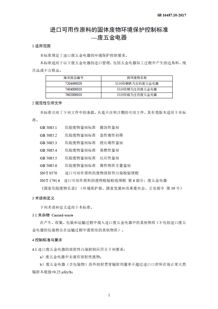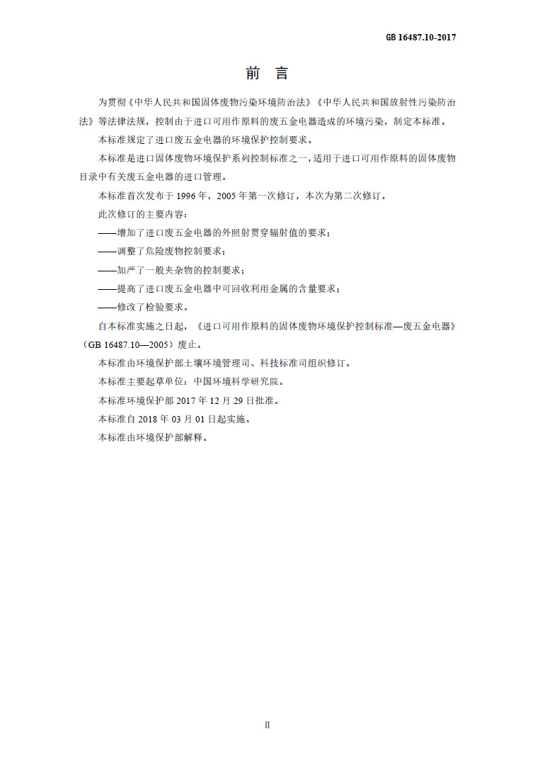 為貫徹《中華人民共和國固體廢物污染環(huán)境防治法》《中華人民共和國放射性污染防治法》等法律法規(guī),控制由于進口可用作原料的廢五金電器造成的環(huán)境污染,制定本標(biāo)準(zhǔn)。本標(biāo)準(zhǔn)規(guī)定了進口廢五金電器的環(huán)境保護控制要求。本標(biāo)準(zhǔn)是進口固體廢物環(huán)境保護系列控制標(biāo)準(zhǔn)之一,適用于進口可用作原料的固體廢物目錄中有關(guān)廢五金電器的進口管理。