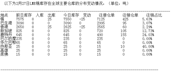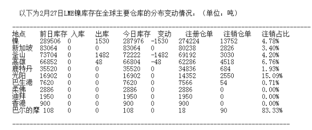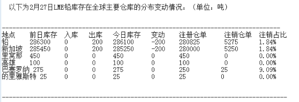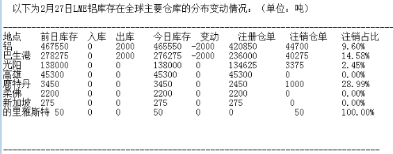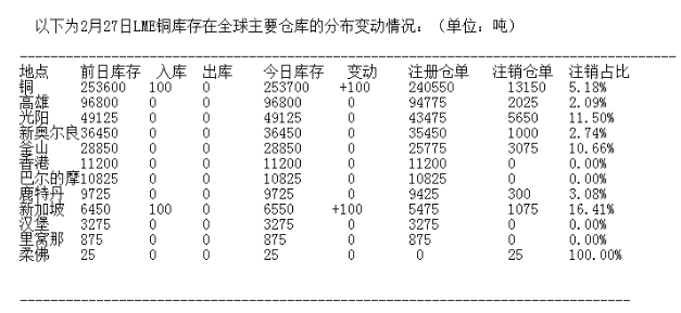 LME 2月27日有色金屬庫存分布情況