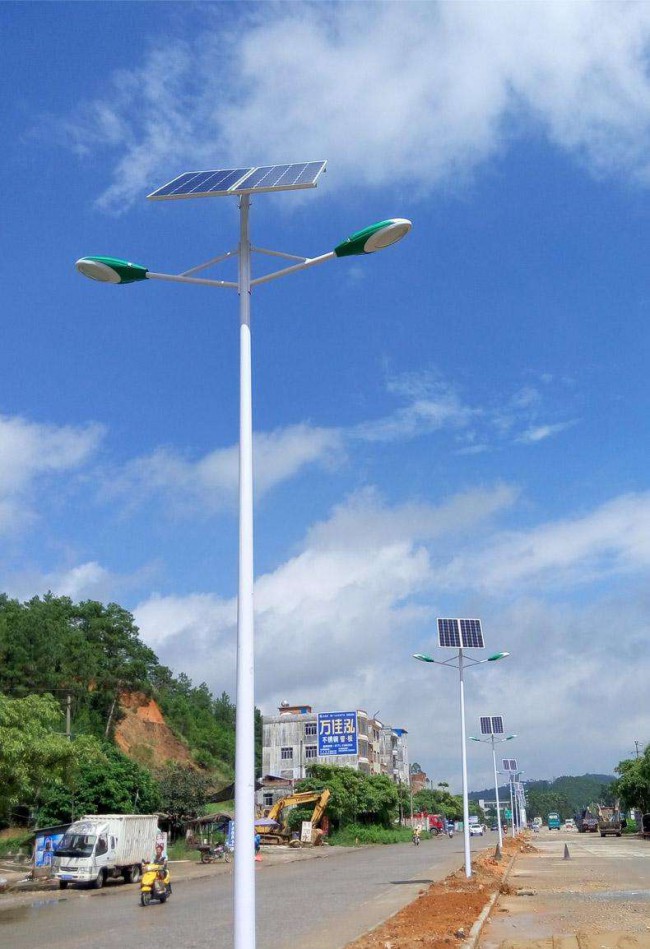 太陽能路燈就是以照明為主,環保、節能為目的制作的采用高效單晶(多晶)硅太陽能電池供電,采用免維護密封型蓄電池貯存電能,用高效節能燈照明,發光效率高、亮度大,并采用先進的充放電和照明控制電路,光敏控制具有性能可靠、安裝方便、無需專人控制和管理。直流供電,無需鋪設電纜電線,無需交流電能和電費,節能、經濟、環保,實用(保證連續陰雨天3-7天能工作),壽命長(太陽能電池可用15~20年、蓄電池可用3~5年),是未來戶外照明的發展方向。
