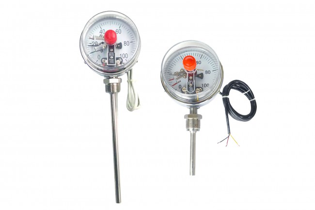 電接點(diǎn)雙金屬溫度計(jì)是利用溫度變化時(shí)帶動(dòng)觸點(diǎn)變化,當(dāng)其與上下限觸點(diǎn)接觸或斷開的同時(shí),使電路中的繼電器動(dòng)作,從而自動(dòng)控制和報(bào)警。