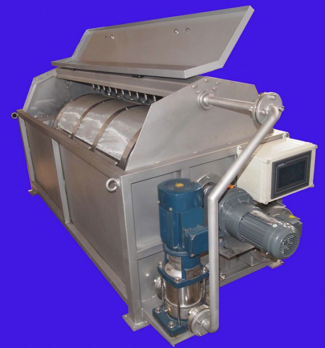 裝置由設備結構模塊、過濾模塊、驅動系統、反沖洗系統、自控系統組成。污水流入空心轉鼓內,由于重力的作用由濾網內側向外側流出,水中的懸浮物被截留在不銹鋼濾網內側。轉鼓緩緩轉動,反沖洗泵抽取濾后出水對網進行反沖洗。沖洗水通過位于轉鼓頂部的噴頭由濾網外側向內側對濾網進行沖洗,沖洗下來的顆粒物質由反沖洗水收集槽收集,并通過排污管排出設備。