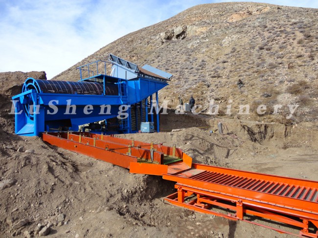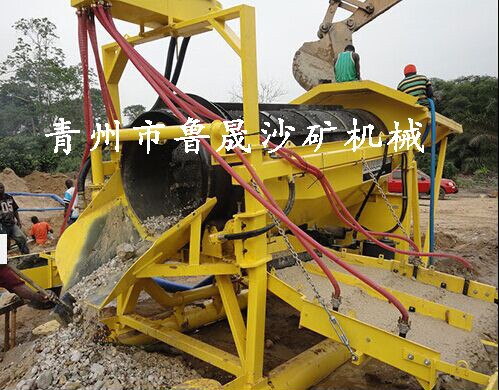 砂金洗礦機利用旋轉的圓筒和內部的刮板以及物料中自有的卵石和巖石來分解粘土,塊狀物和軟氧化物。洗礦機的圓筒慢慢地旋轉,類似于一個巨大的洗衣機。粗細不同的物料還有水同時在一起翻滾攪動,有效地把有用礦物從泥性土壤,粘土中釋放出來.分散均勻后漿狀般的物料被圓筒送到尾端,并從溢流口排到錐形篩進行篩分.錐形篩把大粒度且無價值的物料排除,篩下的礦漿即可直接進入各種選礦設備,如水套離心機,鼓動溜槽,蠕動溜槽,自動選金機等。