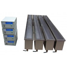電解式陰極陽極雷士超聲波清洗機,該設備組成:超聲波清洗槽、鼓泡漂洗槽、防銹槽組成一體式三槽設備。超聲波發生器將工頻電能轉變成28KHz的高頻電信號,通過高頻電纜輸送到超聲波換能器上,換能器被加上高頻電壓后,產生強有力的超聲振動,在液體中迅速傳播,作用于超聲波清洗槽內液體介質中,產生每秒2.8萬次的振動,從而將工件器件附著的污垢震落,并同時通過正負極電解方式,達到清洗目的。設備具有時間設定、加熱控制、超聲清洗、電解、循環過濾、緊急停止等功能。