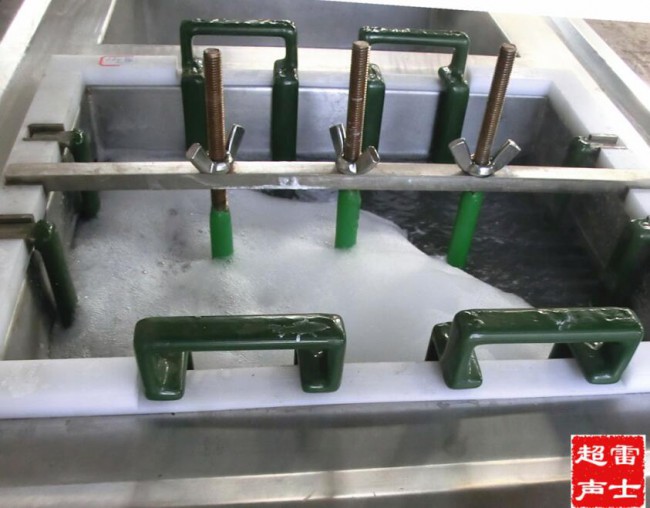 1.將超聲清洗機清洗槽內加入適量清洗液,注意液位必須高于側面超聲波振板高度。