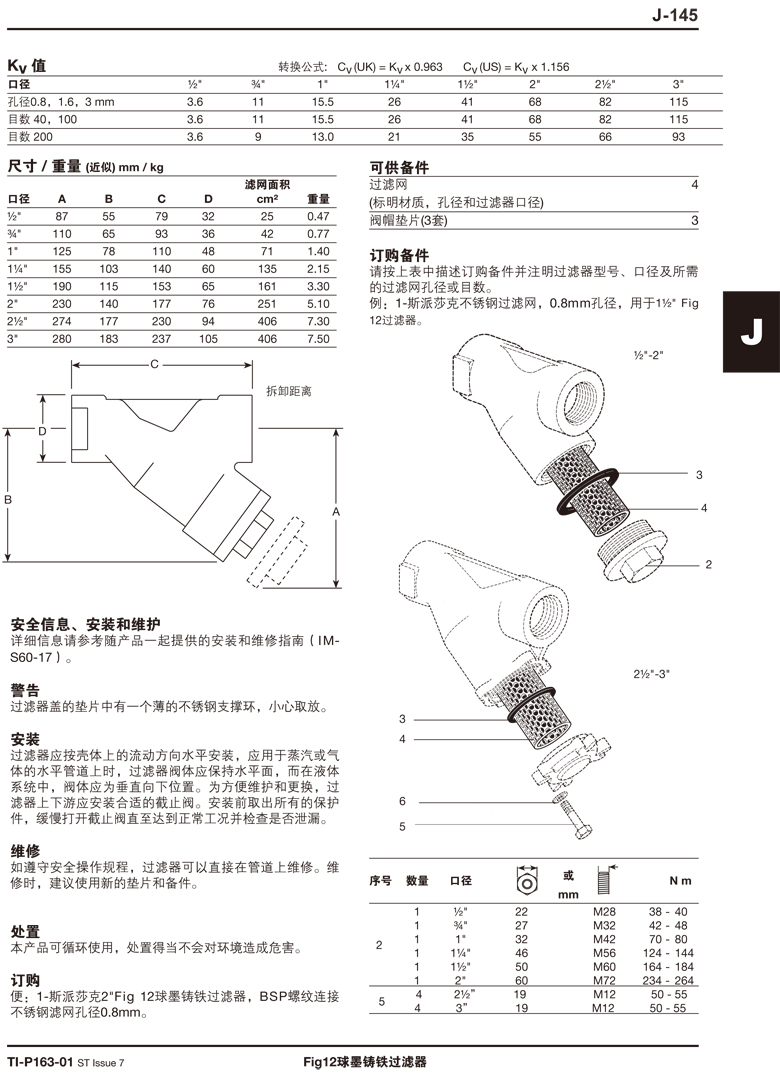 SpiraxSarco斯派莎克FIG12螺紋過濾器的技術參數:
