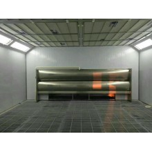 噴漆時,外部空氣經過初級過濾網過濾后由風機送到房頂,再經過頂部過濾網二次過濾凈化后進入房內烤漆房一般是用來噴涂和烘烤車漆的,因此,烤漆房最確切的描述應為"噴烤漆房"。房內空氣采用全降式,以0.2-0.3m/s的速度向下流動,使噴漆后的漆霧微粒不能在空氣中停留,而直接通過底部出風口被排出房外。這樣不斷地循環轉換,使噴漆時房內空氣清潔度達98\%以上,且送入的空氣具有一定的壓力,可在車的四周形成一恒定的氣流以去除過量的油漆,從而最大限度地保證噴漆的質量。