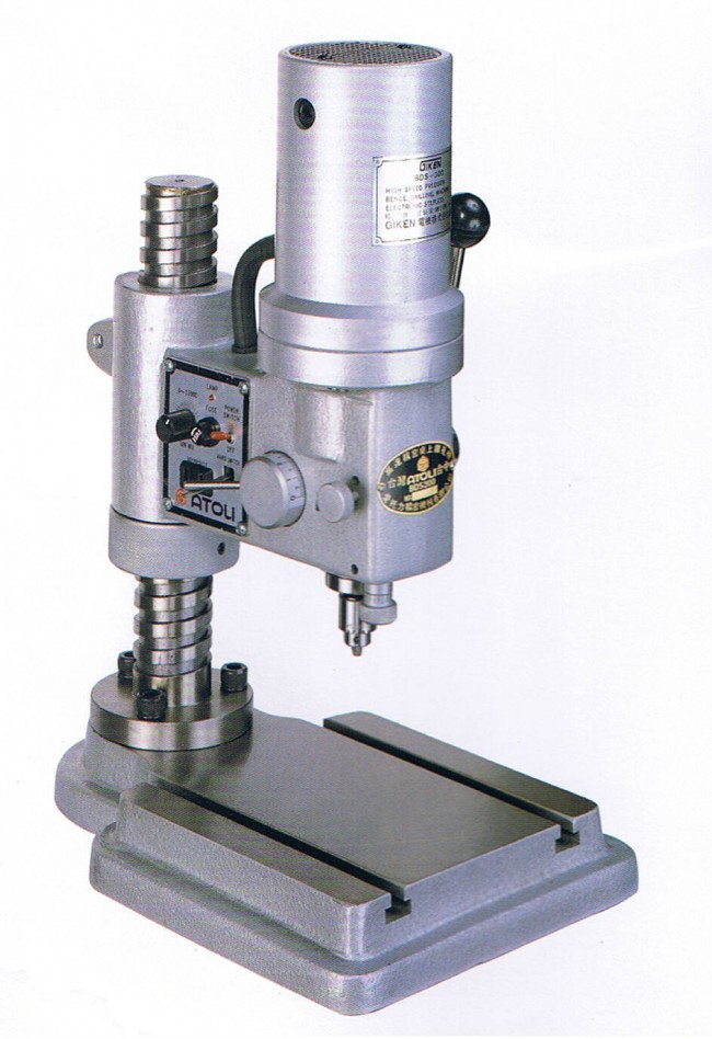 BDS-300 高速精密桌上鑽孔機 用途: 眼鏡、錶、電子、黃金、銅、鋼、鐵、各種精密金屬製品鑽孔都可使用。 優點: ● 各部都經過高度精密加工 、 最適於精密的鑽孔作業。 ● 打擊調整專門用於細微的調整上 、 為操作簡單的一種把手。