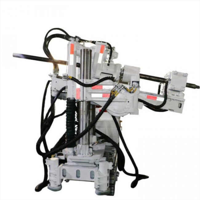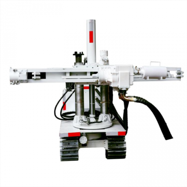 煤礦用履帶式全液壓坑道鉆機采用多個回轉驅動結構,在履帶底盤不動的情況下,依靠回轉驅動旋轉,可實現±180°方位角調整、±180°仰俯角調整,在礦井巷道實現各方位布孔。
