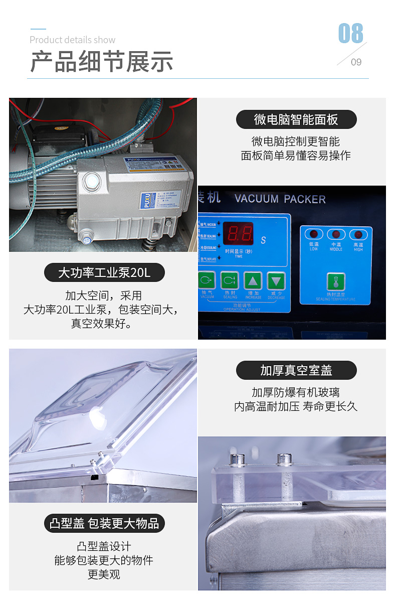 適用于食品、水產(chǎn)、化工原料、電子件、精密零件等產(chǎn)品的真空封口包裝。